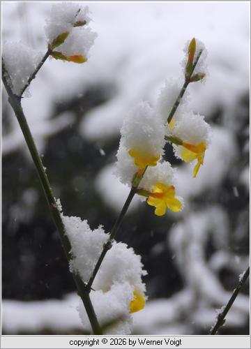 Zur richtigen Zeit Mit der Blütezeit nimmt es der chinesische Winterjasmin (Jasminum nudiflorum) nicht so genau. Aber diesmal passt es. Schnee, Frost und dazu die gelben Blüten. |