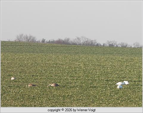 Durchgekommen Auf einem Feld hat sich eine Gruppe von Höckerschwänen (Cygnus olor) gemütlich eingerichtet. Darunter links im Bild auch zwei Jungvögel aus dem Jahr 2025. Die Gruppe hat ein Stück vom Straßenrand entfernt die Gelegenheit genutzt, sich von Rapsblatt zu ernähren. |