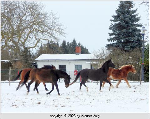 Winterfreuden Die Koppel ist verschneit. Da müssen wir zuerst ein paar flotte Runden drehen. |