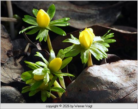 Etwas später In diesem Jahr waren die Winterlinge hier etwss zurückhaltender. Unter der schützenden Blätterschicht bei den Quitten haben sie lange abgewartet. Aber hervorgelockt von den Frühlingstemperaturen sind sie plötzlich wieder da und bringen Farbe in den Garten. |