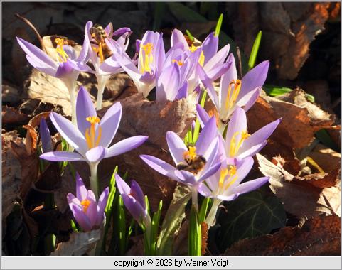 Zuverlässig Gut unter dem Laub der Hainbuche versteckt, blieben die Krokusse lange verborgen. Aber nur zwei Tage nach den Winterlingen sind sie wieder da. Und die ersten Wildbienen nutzen die Gelegenheit zum Blütenbesuch. |