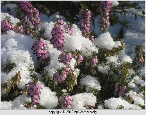 Schneeheide (Erica carnea) Die wenigen Schneeflocken machen das Bild der Winterheide erst stimmig. Während viele Pflanzen deutliche Auswirkungen des strengen Frostes zeigen, ist davon an der Winter- oder Schneeheide nichts zu sehen. Jetzt gibt es natürlich keinen Insektenflug und die Blüten dienen nur als Farbtupfer im Garten. |