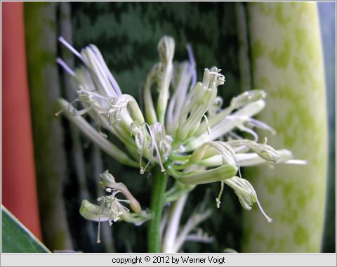 Sansevieria trifasciata Auf der Fensterbank ist auch im Winter etwas zu sehen. Zuerst war da für längere Zeit ein Blütenstand der Sanseviere, der seine Blüten nicht öffnen wollte. Durch den starken Frost war es dicht am Fenster vielleicht etwas zu kalt. Nur die typischen Honigtautröpfchen an den Achseln glitzerten und verströmten wie immer ihren Duft ins Zimmer. Die Blüten haben sich zwar noch geöffnet, sahen aber schon nach sehr kurzer Zeit ziemlich mitgenommen aus. |