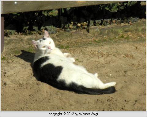 Sonnenbad Nachdem sich unsere Ponys einen anderen Platz zum Sonnen gesucht haben, fühlt sich Nachbars Kater Rudi an dieser Ecke des Pferdeauslaufs sichtlich wohl. Der Sand ist von der Sonne schon etwas angewärmt und passt sich der Körperform gut an. Für Rudi ist das schon mal ein richtig schöner Frühlingstag. Katzenherz, was willst Du mehr! |