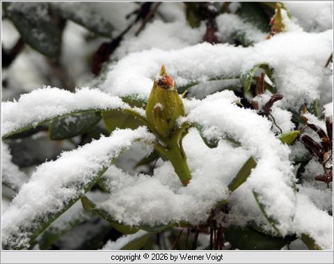 Vorbereitung Am Sylvestertag fallen ein paar Flocken, als sollte zum Jahreswechsel eine Decke die Pflanzen einhüllen und beschützen. Die Fröste der vergangenen Nächte haben aber schon kleine Spuren an dieser Rhododendronblüte hinterlassen. |