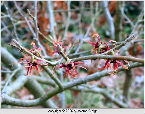Zauberhaft Auch zum Frauentag zeigt die Zaubernuß (Hamamelis) in diesem Jahr noch ihre Blüten. Allerdings ist der kleine Busch in diesem Jahr recht sparsam mit den Blüten. |