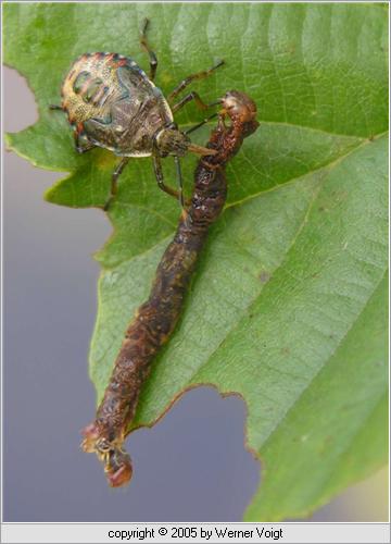 Wanzenmahlzeit Diese Wanze gönnte sich heute eine Mahlzeit aus einer Schmetterlingsraupe. Bisher weiß ich nicht, um welche (von über 800 in Mitteleuropa heimischen) Wanzenart es sich handelt. |