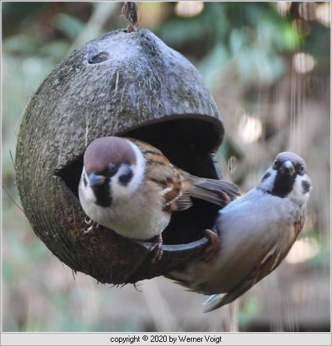 Warten auf Nachschub Gerade haben die beiden Feldsperlinge (Passus montanus) die letzten Sonnenblumenkerne verzehrt. Aber satt scheinen sie noch nicht zu sein. Eigentlich ist das Futter in der Kokosnußschale für die geschickten Meisen gedacht. Aber einige Spatzen haben sich das im Laufe der Zeit abgeschaut und bedienen sich dort auch. Die Feldsperlinge erkennt man leicht an ihrer braunen "Mütze". |
