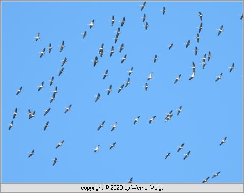 Abzug, oder? Größere Gruppen von Kranichen (Grus grus) waren am Monatsanfang kaum zu überhören, als sie sich vermutlich auf die Reise in ihre Winterquartieren machten. Allerdings deutet das Flugbild wegen fehlender Keilformation eher auf einen kurzen Trip zu neuen Futterplätzen. |