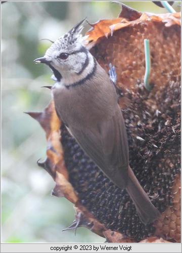 Seltener Gast Erstmalig sah ich eine Haubenmeise (Lophophanes cristatus) an meinem Futterhaus. Daneben hatte ich probeweise eine Sonnenblume aufgehängt. Leider blieb es bei diesem einen Besuch im Oktober. |