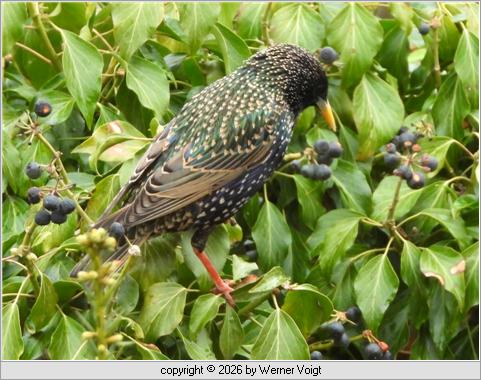Die Stare (Sturnus vulgaris) sind schon einige Zeit zurück. Nun hat sich das erste Exemplar auch an der Efeuhecke eingefunden. Es geht um die Beeren des Efeu. Wahrscheinlich sind die erst nach den Frösten so richtig schmackhaft. Erst jetzt ist da häufiger ein Vogelbesuch zu sehen und die Fruchtstände sind inzwischen schon etwas dezimiert.